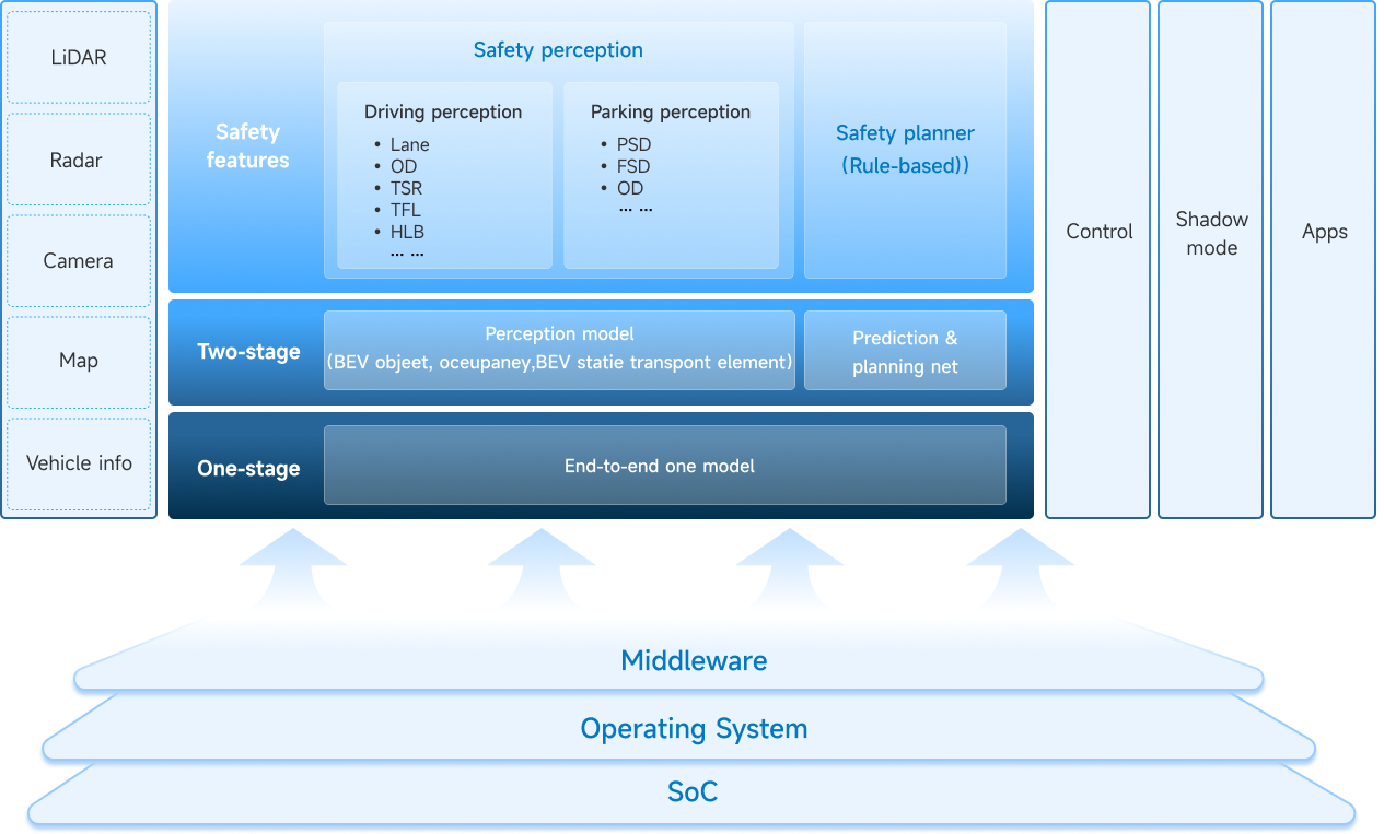We have built up a VLA/VLM architecture through deep integration of end-to-end methodologies and large language models that enables advanced object recognition, accurate prediction of traffic participants’ behavioral intentions and comprehensive environment understanding. Our natural-language-driven trajectory generator strengthens the explainability of our AI systems, thereby enhancing trust from both users and regulators. Our systems achieve exceptional robustness leveraging multimodal fusion and redundant safety mechanism. Our system architecture can compensate for limitations of standalone end-to-end system in extreme conditions, reducing false detections, and optimizing our ability to address long-tail issues through an AI model with high generalization ability. We adopt the idea of developing light-weight AI models with enhanced reasoning efficiency. We compress model parameters by applying model pruning, quantization and distillation technologies. Based on our deep understanding of various SoC platforms, we have also implemented a multi-core parallel scheduling mechanism that maximizes the utilization of heterogeneous computing power under a CPU-NPU collaborative SoC architecture.